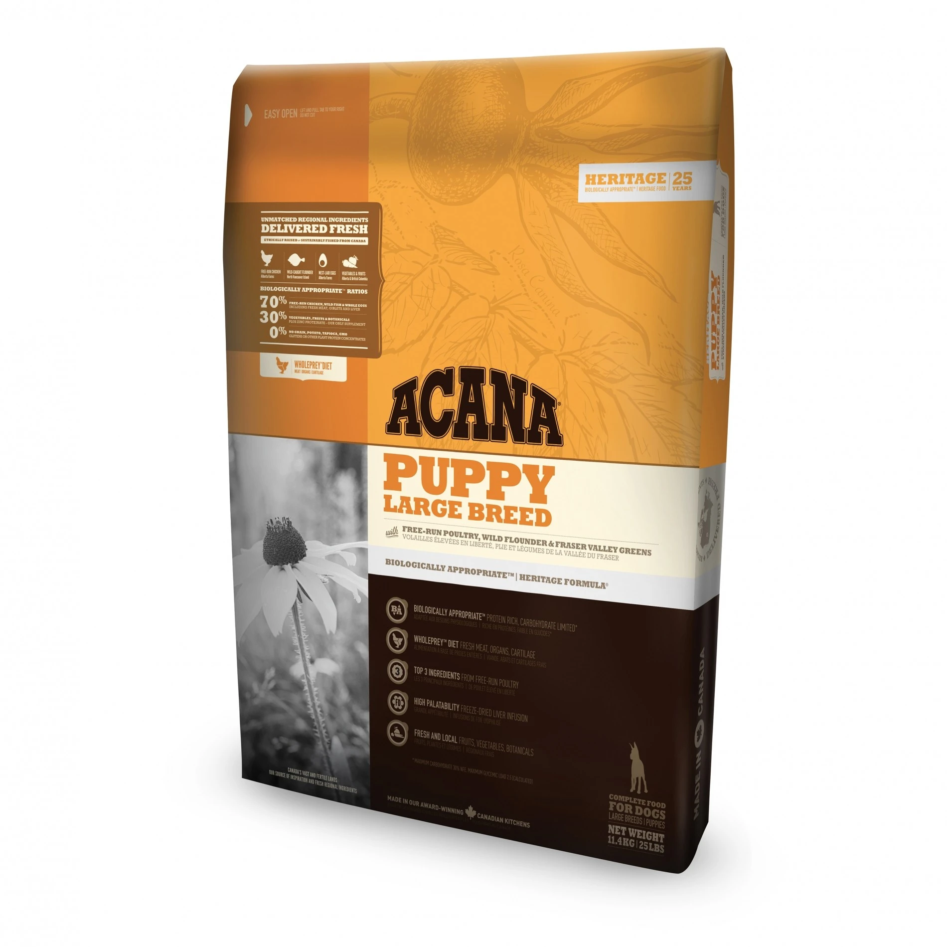Les croquettes Acana Dog / Heritage Puppy large breed sont spécifiquement conçues pour les chiots de grande race du sevrage jusqu’à 24 mois. Les croquettes Acana Dog / Heritage Puppy large breed répondent parfaitement aux besoins nutritionnels de ces chiots pendant la période sensible de la croissance :