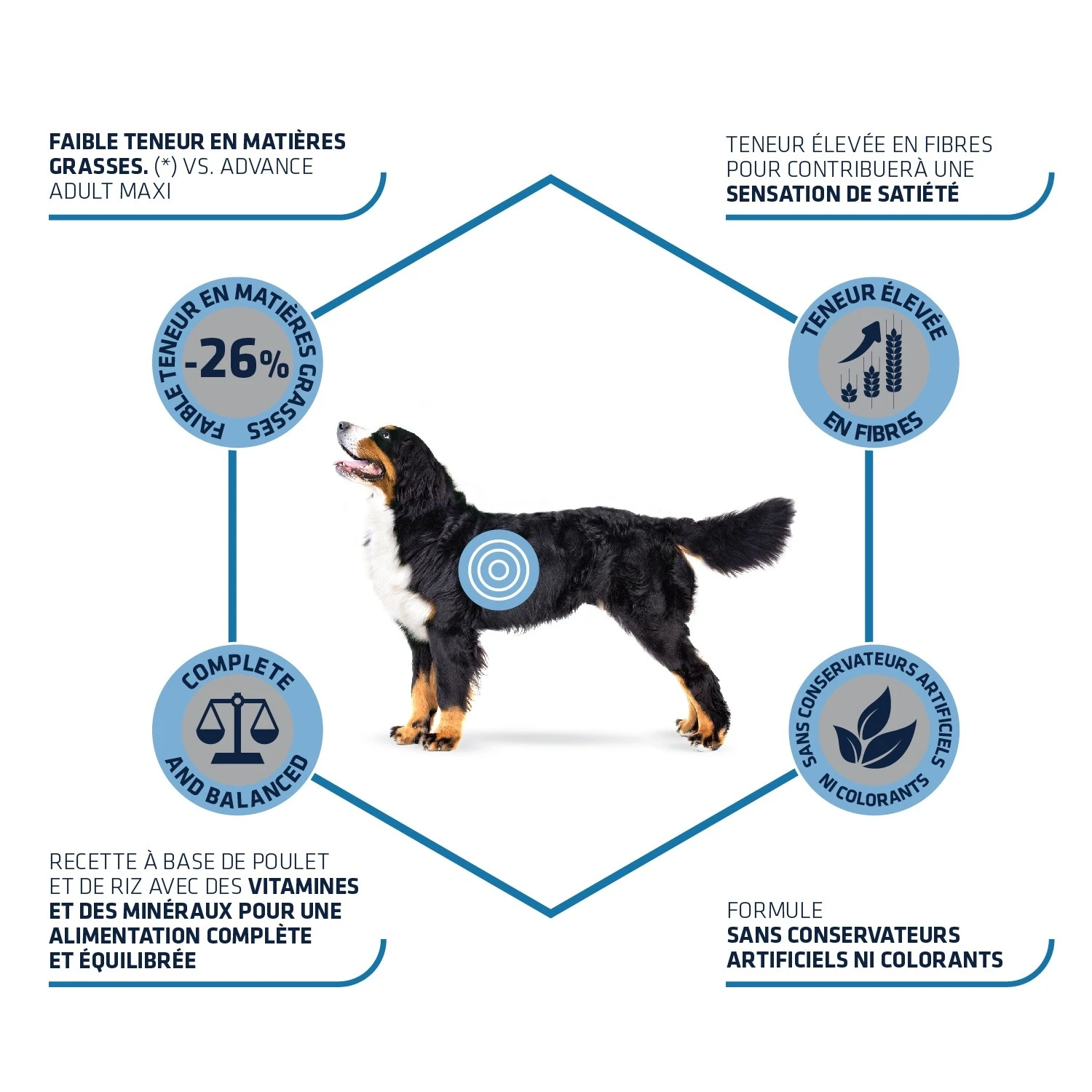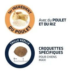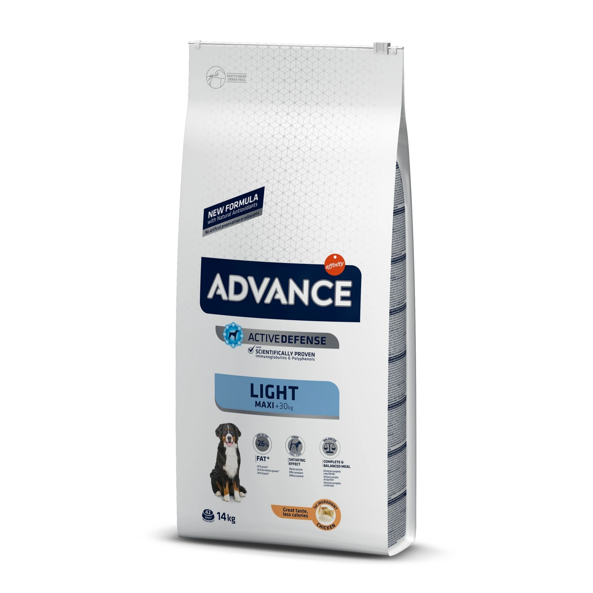 Les croquettes Advance Maxi Light ont une taille adaptée aux mâchoires et à la dentition des chiens de grande race. De plus, elles contiennent des pyrophosphates qui sont des minéraux contribuant à prévenir la formation de tartre.