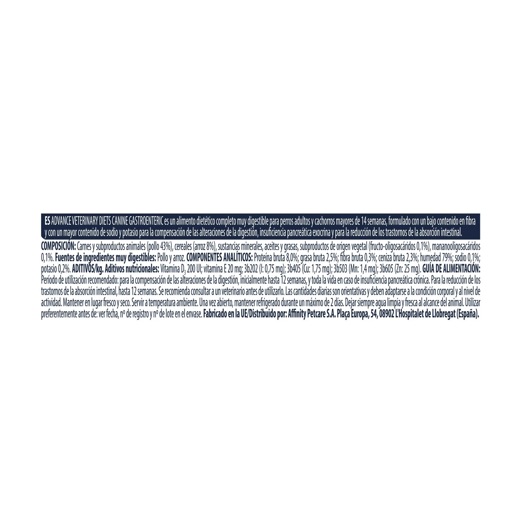 ADVANCE Veterinary Diets Gastroenteric est un aliment complet sous forme de pâtée au poulet en sachet pour chien de 14 semaines et plus souffrant de troubles de la digestion et d’insuffisance pancréatique exocrine.