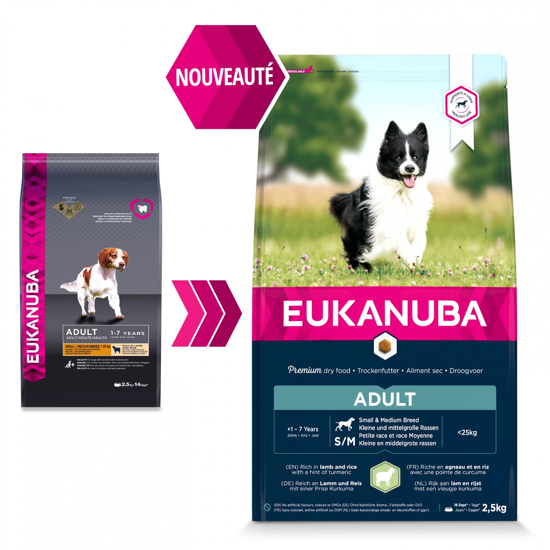 L’aliment Eukanuba Adult Small & Medium Breeds Agneau et Riz convient parfaitement aux chiens adultes de petites et moyennes tailles (jusqu’Ă 25 kg) ayant une digestion sensible.