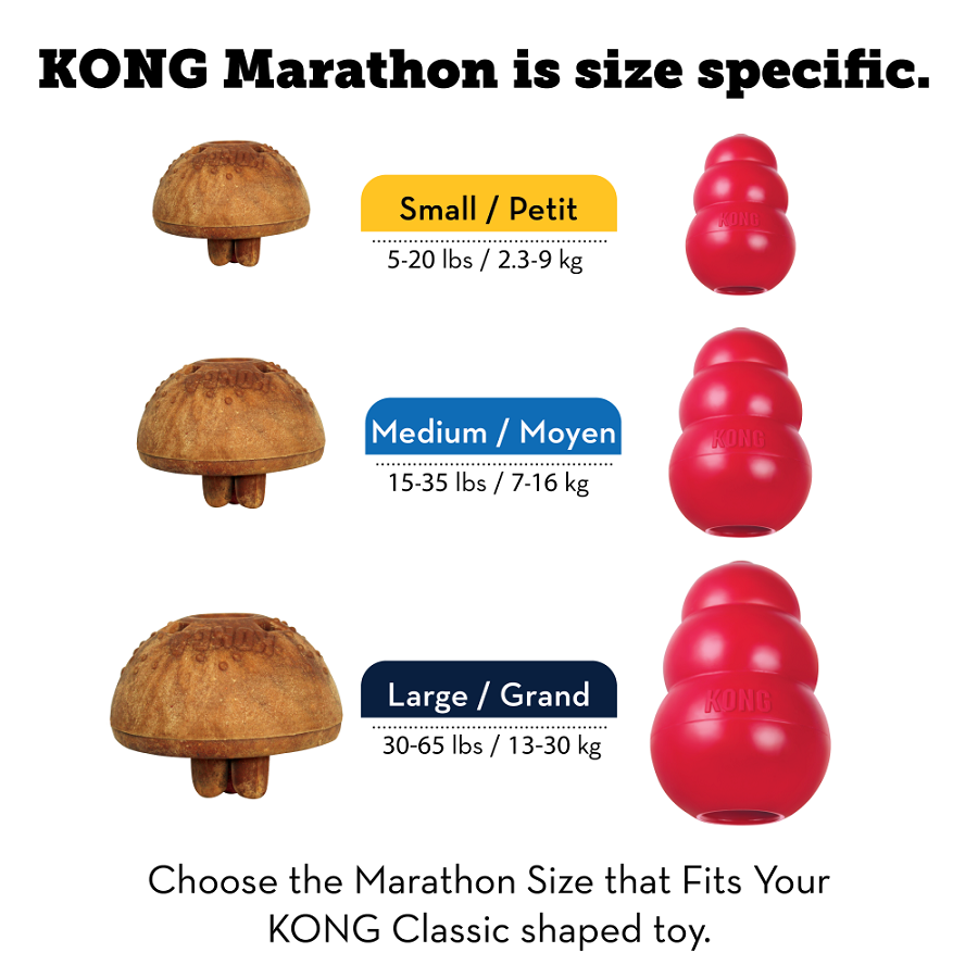 La friandise KONG Marathon offre une solution stimulante au besoin de mastiquer. De taille parfaite pour les jouets en caoutchouc KONG Classic, cette friandise pratique et sans dĂ©gâts est remplie de plaisir. Pour commencer, les arĂ´mes Ă©veillent les instincts naturels de mastication, ensuite l’extĂ©rieur robuste prolonge l’intĂ©rĂŞt et enfin, les pinces comestibles incitent Ă la recherche de nourriture quand qu’elles tombent Ă l’intĂ©rieur du jouet dès que le chien a fini de manger l’extĂ©rieur. Le KONG Marathon est un produit naturel, sans cĂ©rĂ©ales et fièrement fabriquĂ© aux États-Unis. Facile Ă positionner dans un KONG, il suffit de l’enfoncez puis de la tournez lĂ©gèrement pour bien la bloquer dans le KONG et crĂ©er un festival de gâteries.Â