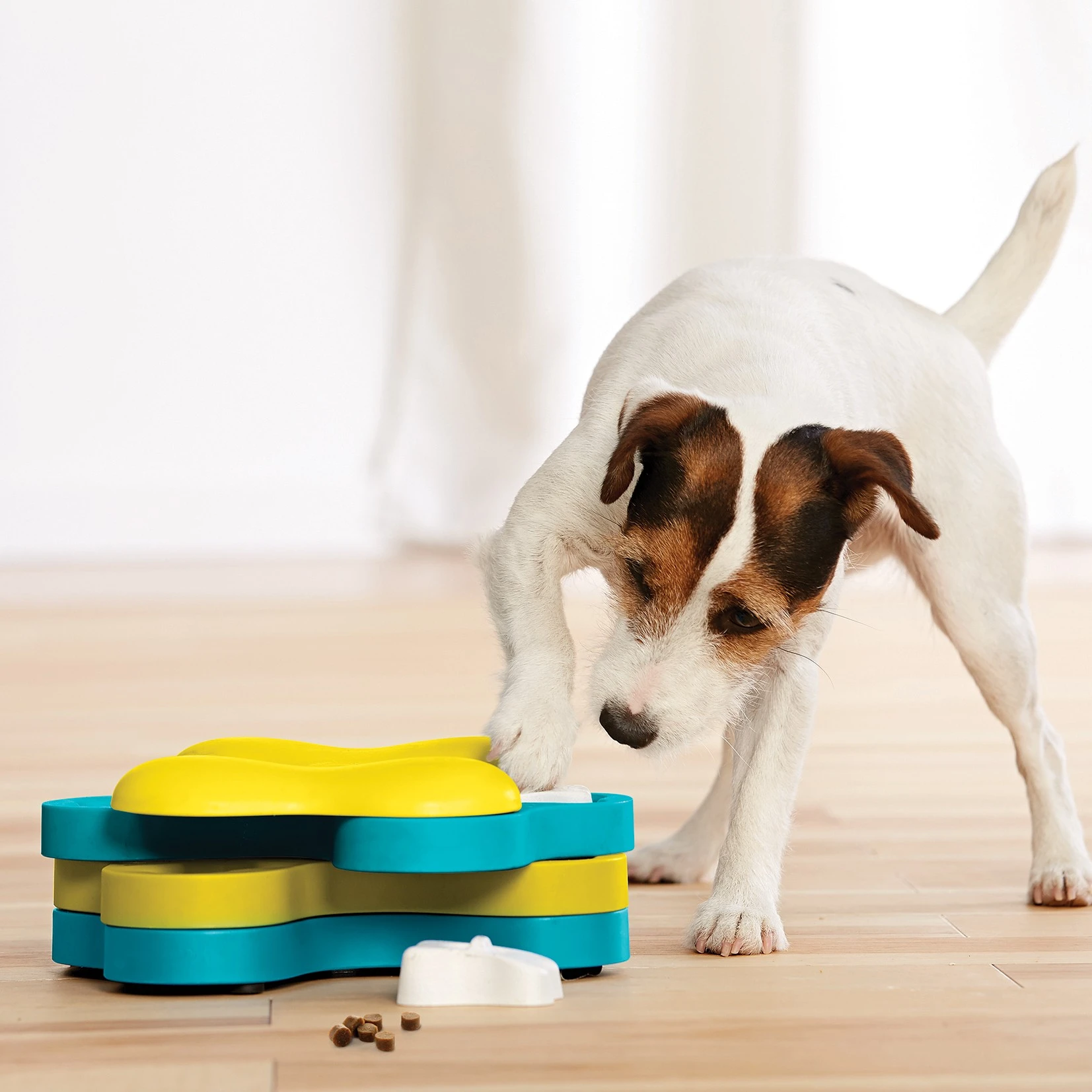 Développé par Nina Ottosson, il est composé de 12 compartiments répartis sur trois étages où vous pouvez cacher ses friandises ou croquettes préférées. Il suffit à votre chien de faire tourner chaque étage avec ses pattes ou son museau pour découvrir ses récompenses et se régaler ! Vous pouvez lui montrer la marche à suivre avant de le laisser s’amuser en toute autonomie ou partager des moments complices.