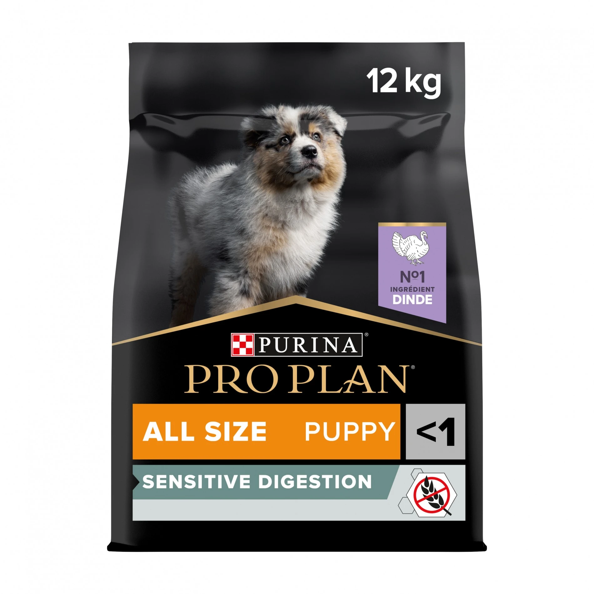 PRO PLAN Sensitive Digestion No Grain All Breed Puppy est un aliment complet sous forme de croquettes à la dinde et sans céréales pour chiot de toute taille de moins d’un an sujet à des troubles de la digestion.
