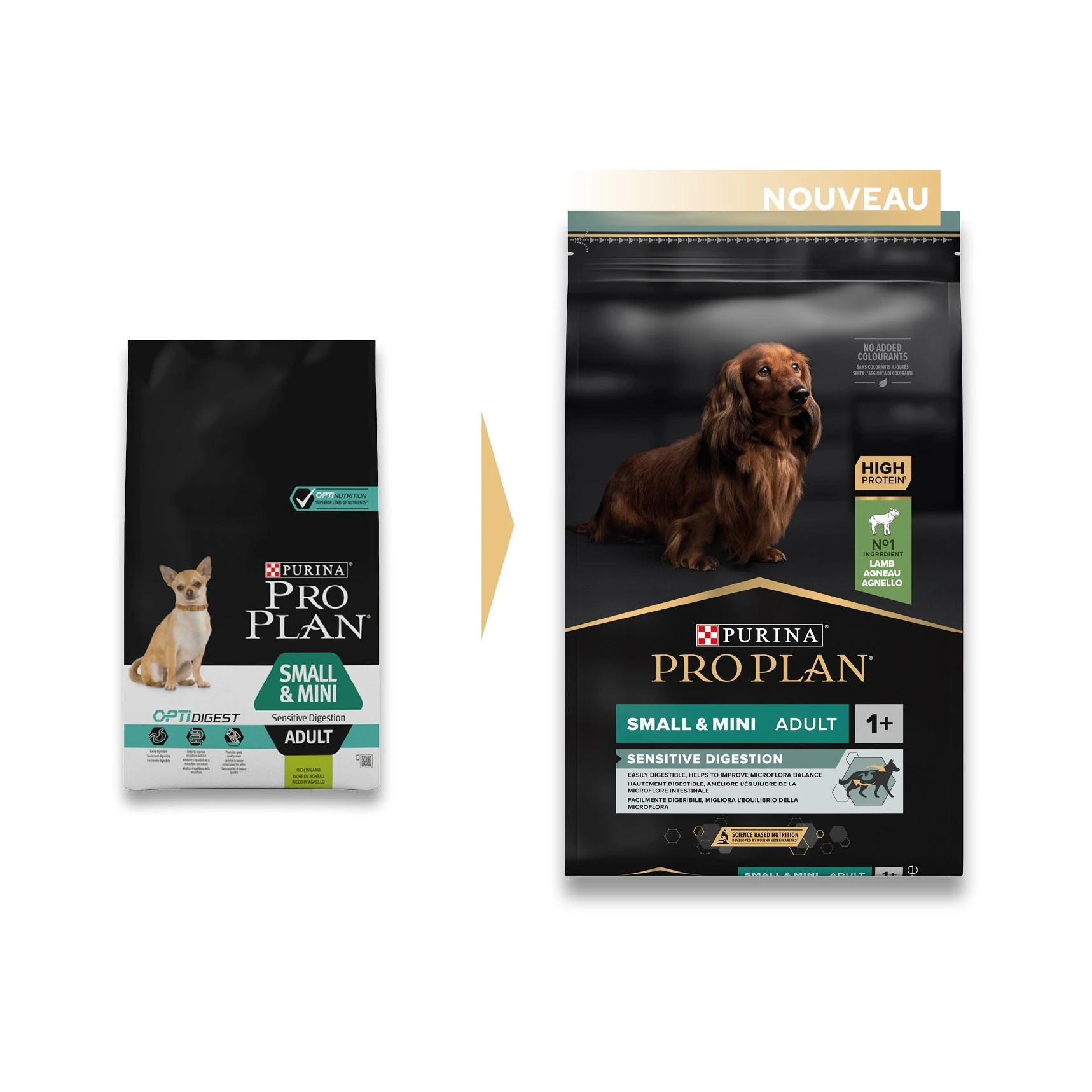 Les croquettes pour chiens PRO PLAN Sensitive Digestion Small & Mini Adult de Proplan répondent aux besoins des chiens adultes de petite race (poids adulte inférieur à 10 kg) présentant une sensibilité digestive.