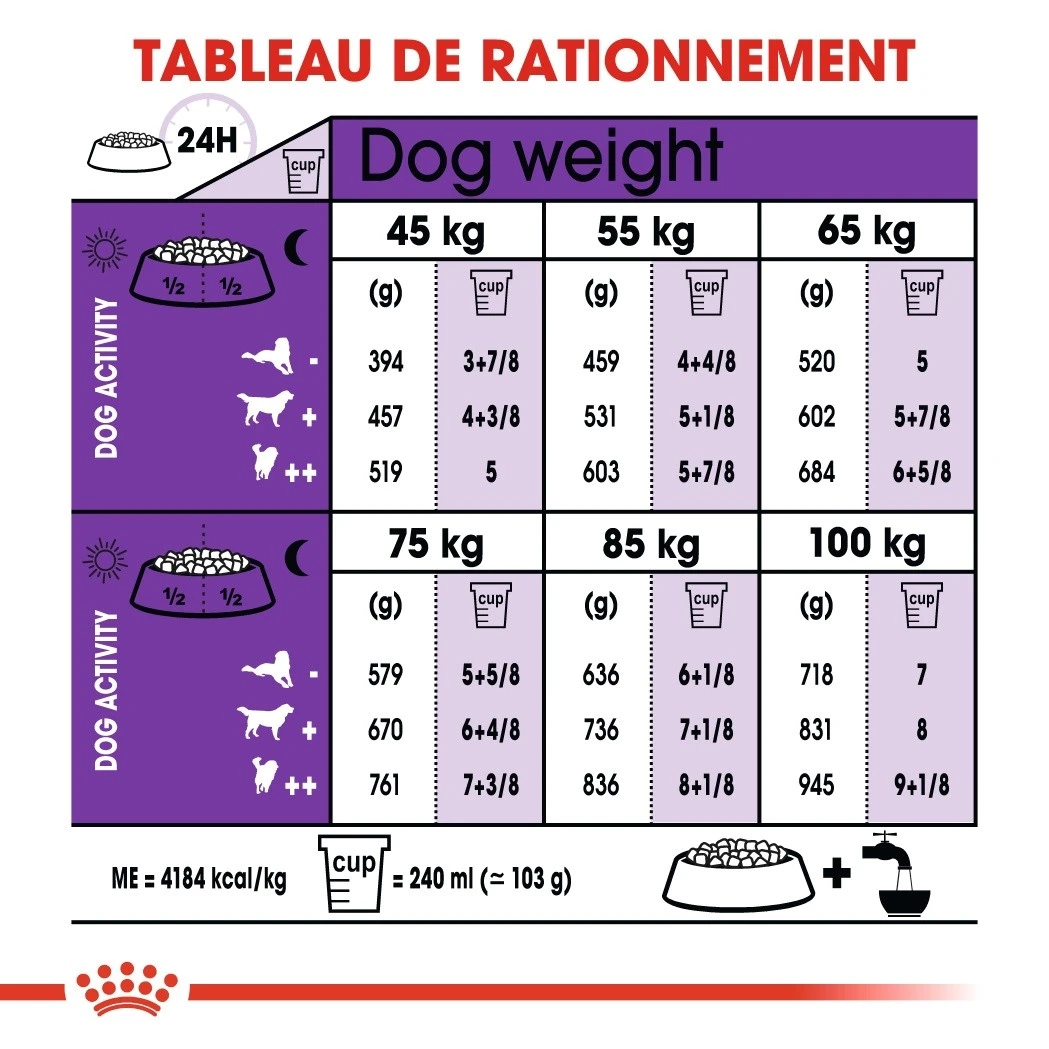 ROYAL CANIN® Giant Adult est Ă©laborĂ© pour satisafire les besoins nutritionnels des chiens adultes de très grande taille de plus de 18/24 mois, pesant 45 kg ou plus.Â