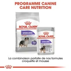 ROYAL CANIN® Sterilised Medium convient aux chiens adultes stĂ©rilisĂ©s de plus d’un an et pesant entre 11 et 25 kg.Â