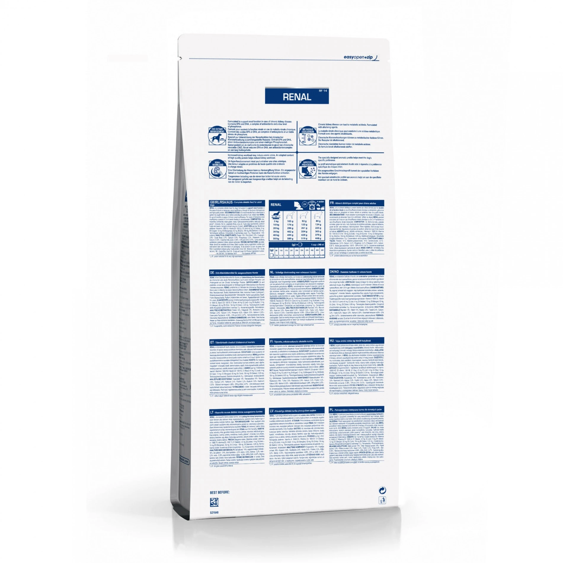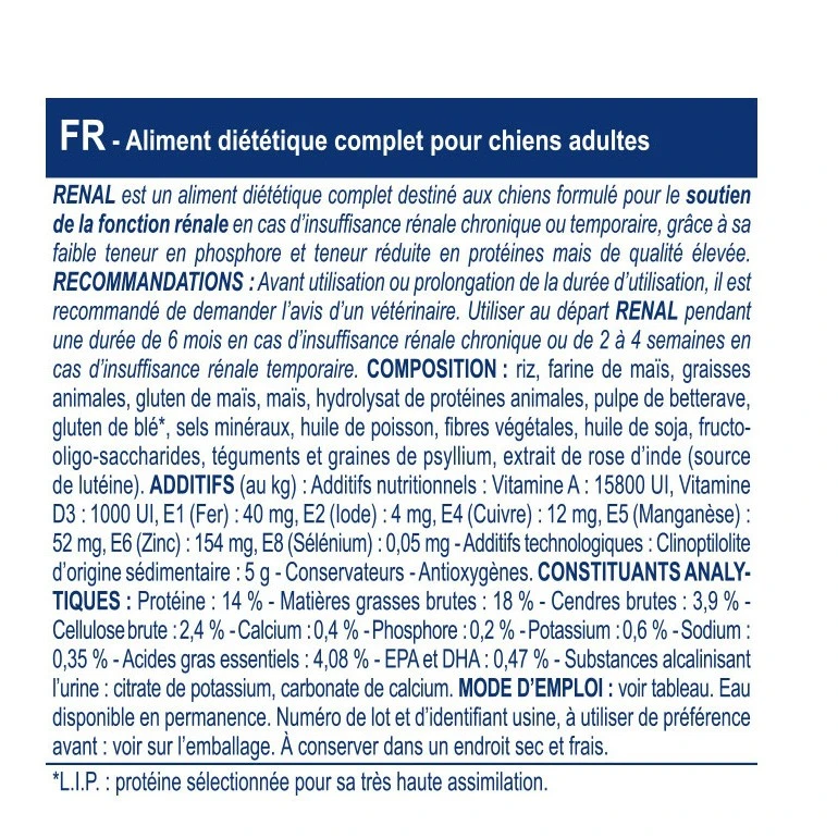 L’aliment Royal Canin Renal est formulĂ© pour les chiens adultes souffrant d’IRC (insuffisance rĂ©nale chronique), d’insuffisance hĂ©patique diagnostiquĂ©e ou d’urolithiase (calculs d’oxalate de Ca, calculs d’urate).