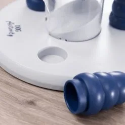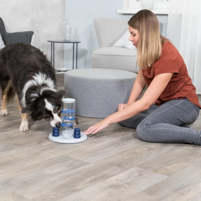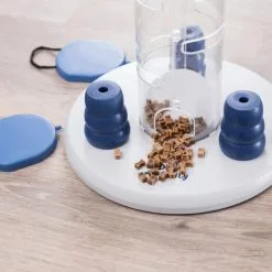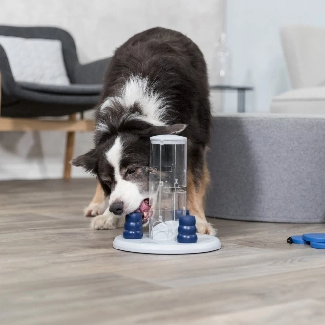 Votre chien devra faire tomber les friandises d’un compartiment Ă l’autre jusqu’au bas de la tour en tirant sur les cordes ou bien soulever les quilles avec son museau pour accĂ©der Ă la rĂ©compense.
