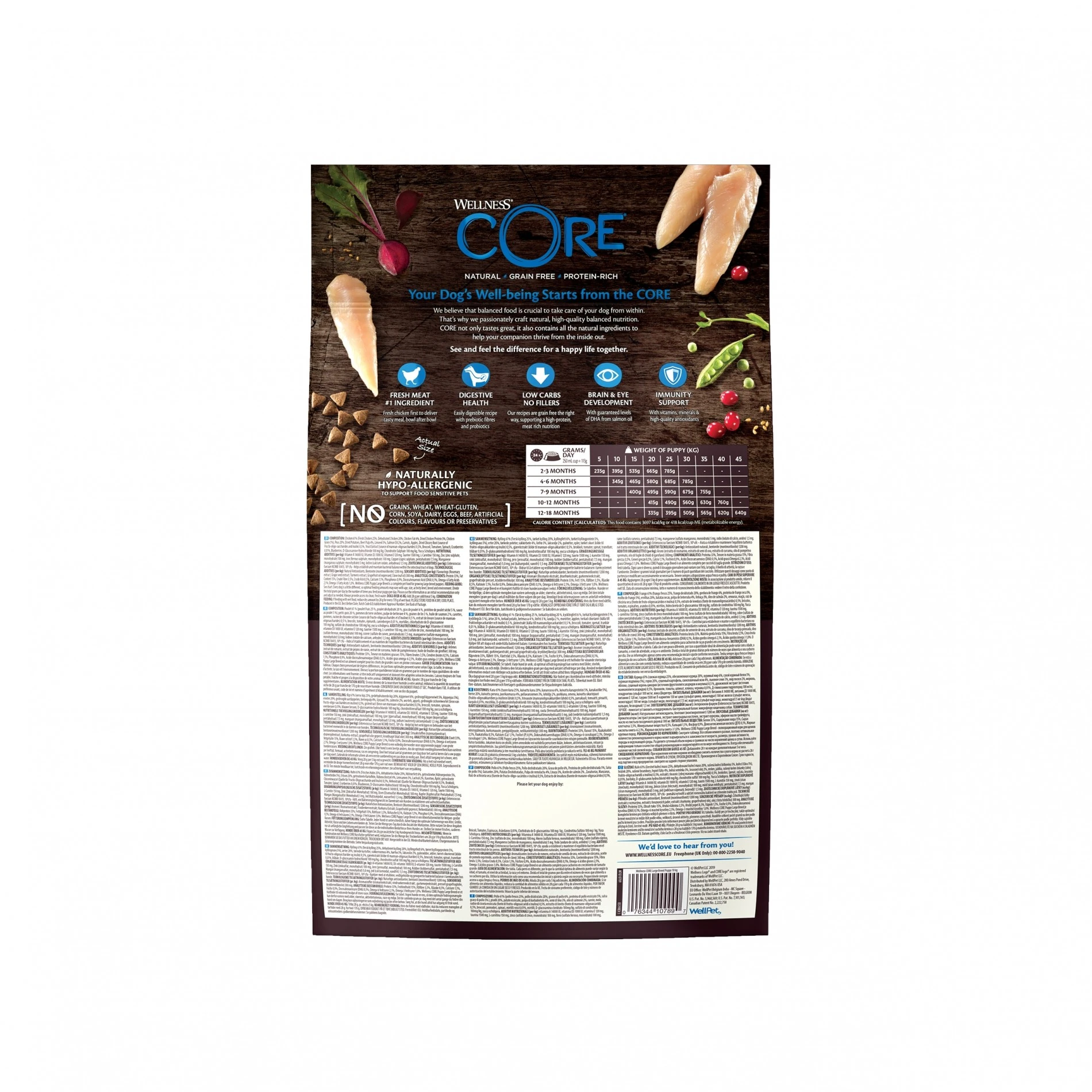 Les croquettes Wellness CORE Puppy Original contiennent du poulet en premier ingrĂ©dient. Elles sont aussi composĂ©es d’un acide gras omĂ©ga-3 provenant de l’huile de saumon, le DHA, qui participe au bon dĂ©veloppement du cerveau et des yeux, ainsi que des niveaux optimaux de calcium et des protĂ©ines de haute qualitĂ© pour un bon dĂ©veloppement de la musculature et des os.