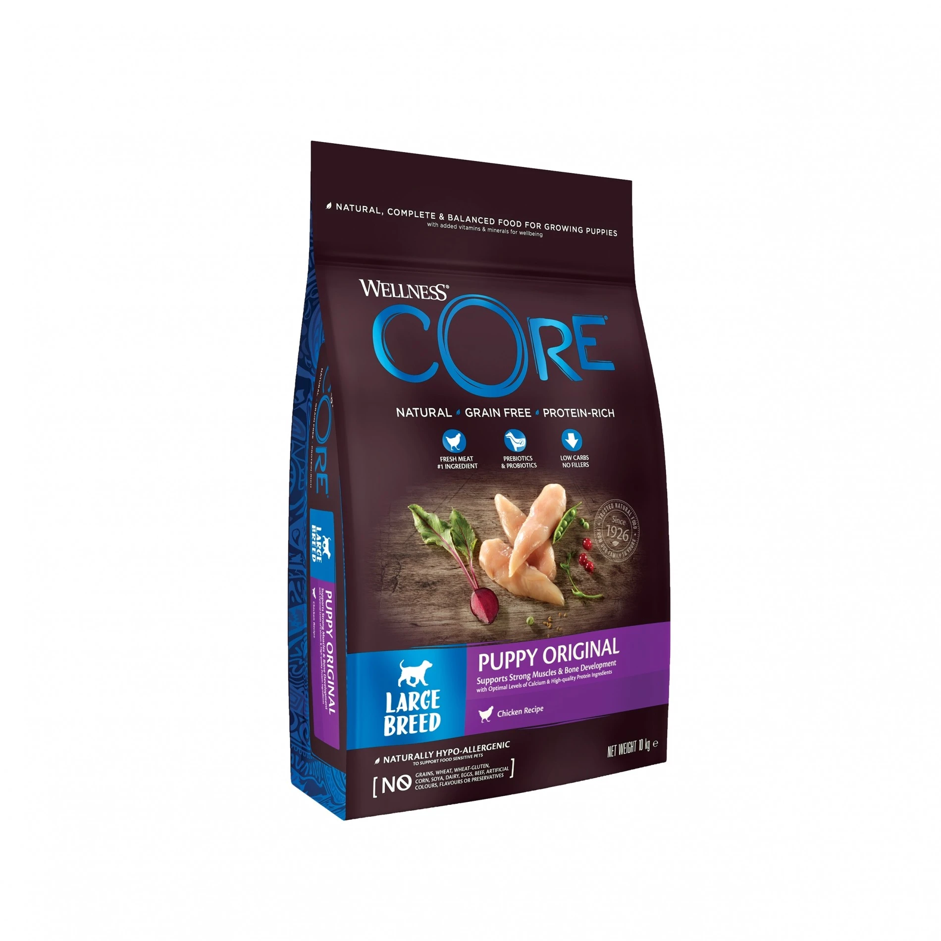 Les croquettes Wellness CORE Puppy Original sont complètes et équilibrées pour les chiots de grande race. Leur composition se rapproche du régime alimentaire naturel des chiens : elles sont sans céréales, riches en protéines, pauvres en glucides et elles contiennent de la viande fraîche. Elles sont sans colorants, arômes et conservateurs artificiels.