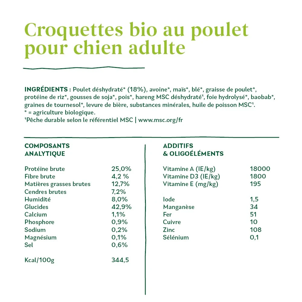 La combinaison de poulet et de cĂ©rĂ©ales est très digestible pour votre chien. En outre, cet aliment minimise le risque d’allergies et les troubles gastro-intestinaux. Le hareng MSC* est riche en acides gras et en omĂ©ga 3 dont l’effet anti-inflammatoire est bĂ©nĂ©fique Ă la peau et au pelage, permettant Ă©galement de garder les articulations flexibles. Les pois biologiques dans ces croquettes au poulet sont une source de fibres sans gluten